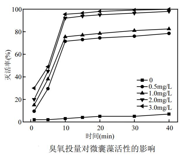 1.臭氧滅活銅綠微囊藻與其濃度和作用時間都有關系,隨著臭氧濃度和作用時間的延長,藻滅活率明顯增加, 很高去除率達到 99.0%(初始藻細胞密度 1.0×107個/L,臭氧濃度 2.0mg/L,作用時間40min,濁度為 1.0 NTU,溫度 25℃, pH 7.5).