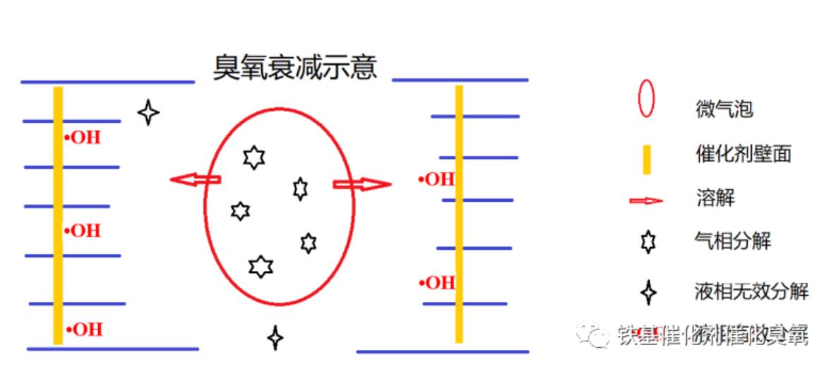 臭氧液相溶解與衰減:影響因素相互交叉,比較復雜。如紊動,既可增強溶解、又可強化衰減,而衰減包括有效分解和無解分解。三過程對反應器工況影響巨大,簡單地想象一下:若溶解慢,大部分臭氧被氣泡攜帶,則在池上部的分布多;若溶解快,大部分臭氧被水流攜帶,若氣液逆向流,則在池下部的分布多。若無效分解比有效分解慢得多,催化劑填料高度小些也問題不大;若兩種分解速率差不多,催化劑填料不僅高度要大,而且在池中位置影響很大。因此,反應器的優化,包括:臭氧布氣器形式(氣泡大小)、是否氣液逆向流、催化劑區域高度和位置等,都依賴于臭氧溶解與分解動力學的建立。