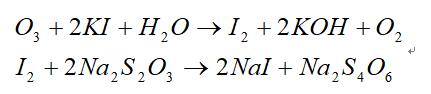 1. 方法原理:一般采用化學(xué)碘量法。利用臭氧與碘化鉀的氧化還原反應(yīng),置換出與臭氧等當(dāng)量的碘。再用硫代硫酸鈉與碘作用,以淀粉為指示劑,待完全反應(yīng)生成無色碘化鈉。根據(jù)硫代硫酸鈉的消耗量計(jì)算出臭氧濃度。其化學(xué)反應(yīng)方程式如下:
