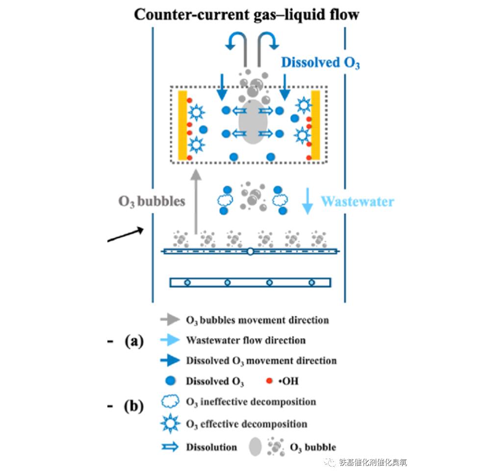 從工程工藝角度,催化劑整砌填料是反應(yīng)的內(nèi)因;而反應(yīng)器,是催化臭氧化的外因。我曾吃驚地發(fā)現(xiàn),我們對此了解得甚少,由此限制了催化臭氧化效率的提高。除氧化反應(yīng),反應(yīng)器中多相變化有:一相溶解(臭氧向水相溶解);二相流動(氣泡上浮、水流動);三種分解(臭氧在氣相分解、在液相無效分解;在催化劑區(qū)有效分解),如圖示。