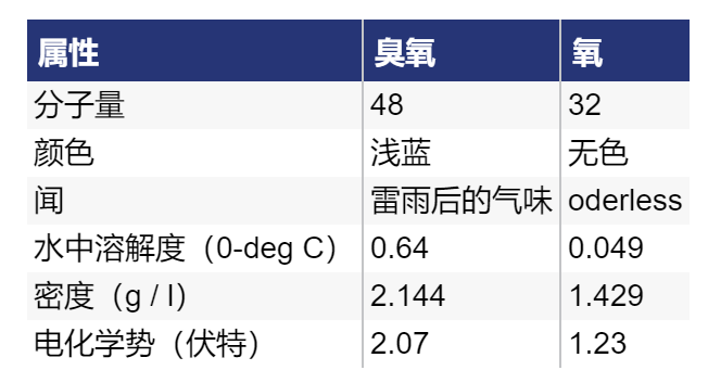 臭氧是水和空氣應(yīng)用中 很強(qiáng)大的氧化劑之一。請參閱下面的臭氧的不同屬性:
