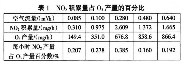 由表l可看出,隨著空氣流量增大(0.10 m3/h~0.64 m3/h),臭氧產量由351.0 mg升高到866.4 mg,NO2的產量在0.975mg~2.609 mg之間波動;當空氣流量為0.64 m3/h時,臭氧產量增幅不明顯,且NO2產量高于空氣流量為0.48 m3/h時的產量。原因是發生器在該流量下工作時溫度較高,臭氧分解率較高,由于空氣流量大,發生腔中氣體平均停留時間短,導致臭氧生成速率低于分解速率,而此時卻有利于NO2的形成。